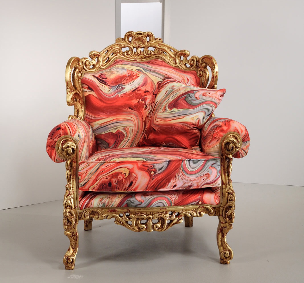 The Splendid armchair from the Italian company RM Arredamenti, a collection of Capriccio. The frame is carved, made of solid beech wood, painted in Golden color, the surface is lacquered aged. Upholstery textile. Filler – foam of different density. Seat cushion is removable.