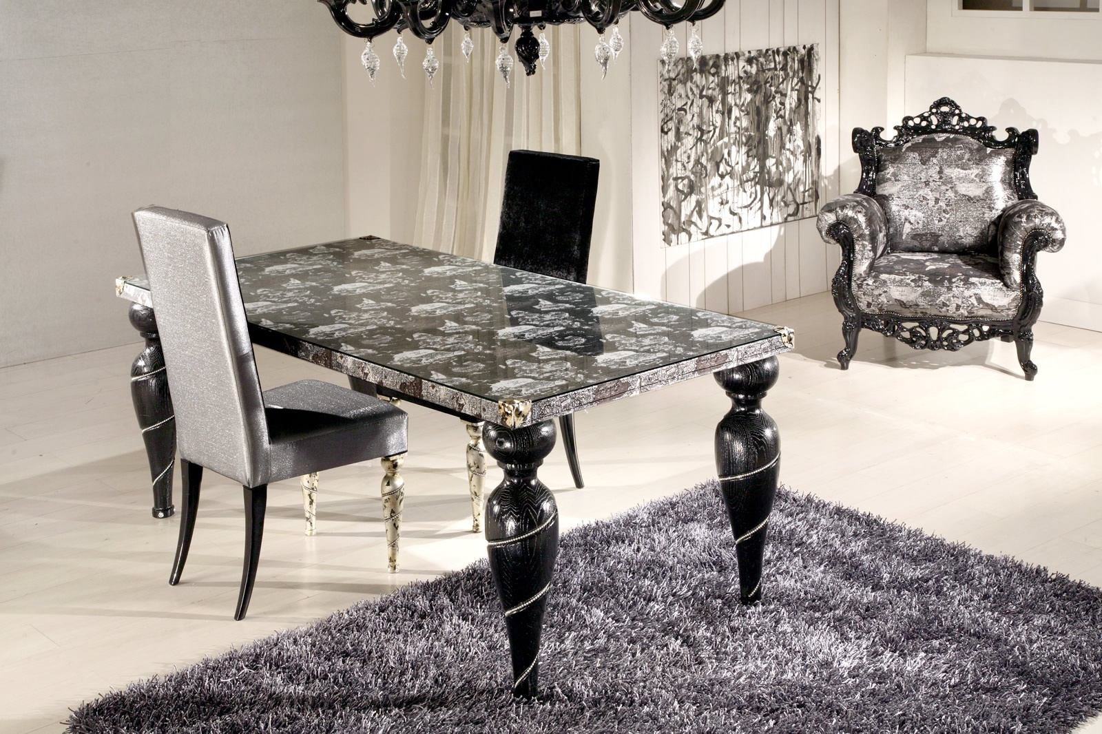 Dining table Map from the Italian company RM Arredamenti, a collection of Capriccio. The table top is made of MDF with thickness 50 mm, covered with textiles in shades of gray, augmented with glass. Massive legs made of solid oak, decorated with hand carved and Swarovski crystals, black color.