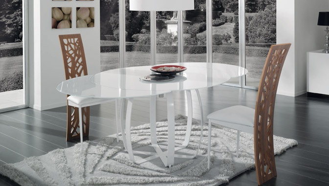 Dining table Basilea Leas, from the Italian manufacturer IdealSedia. The frame is made of wood. Table top finished with high gloss varnish. Round table top can be increased. The legs are made of metal. Color scheme - white. The table is designed for modern interior dining room.
