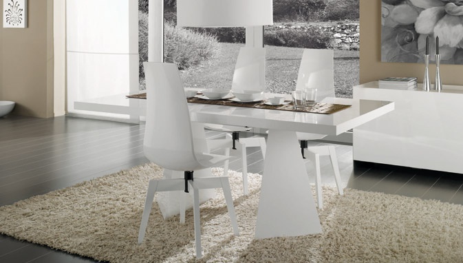 Puebla dining table from Italian manufacturer IdealSedia. The frame is made of wood. The countertop is made of wood with a high gloss finish. The legs are made in the shape of a pyramid. Color scheme - white. The countertop is increased. The model is made in modern style.