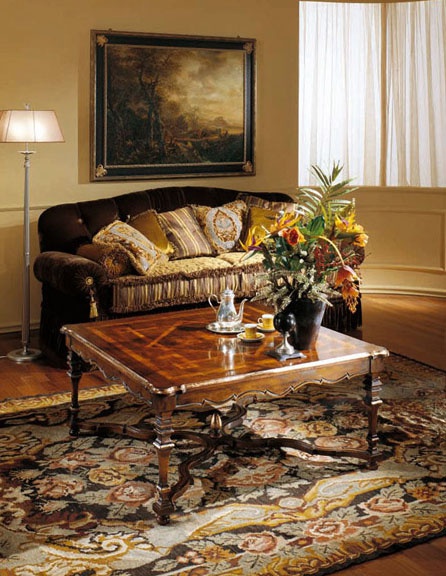 Coffee table from the Italian manufacturer Palmobili. Made in a classic style table fits into any traditional or modern interior. Material - solid wood. Carved legs, X-shaped crossbar decorated with sculpted elements. Square top with marquetry decoration. There are several options for finishing.