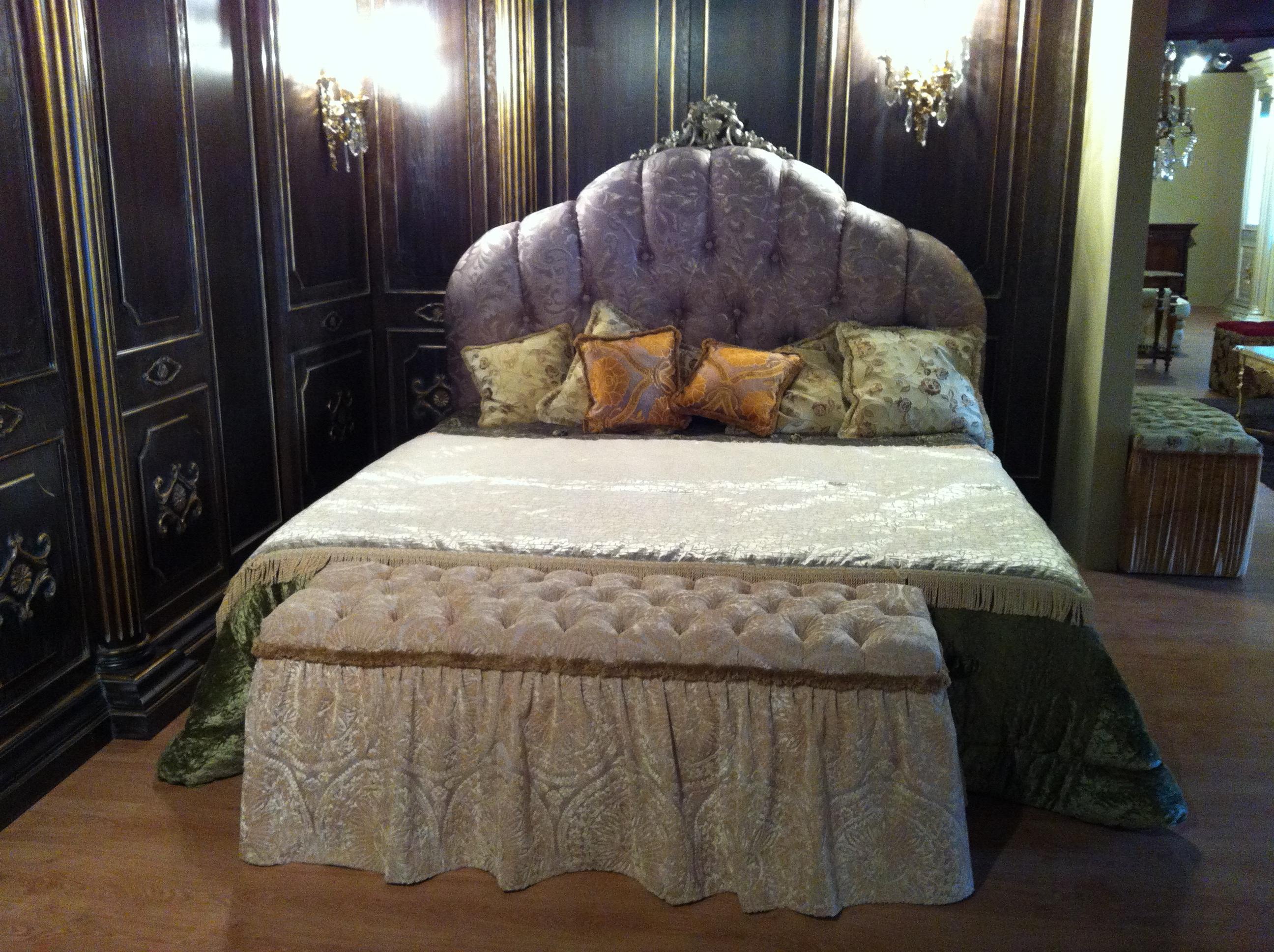| Description: | Double bed from Italian manufacturer Palmobili. Luxurious bed in the Rococo style will be the center of the bedroom, furnished in a traditional style. The frame and legs of solid wood fully upholstered with textile. High figured quilted headboard and finished with recessed buttons. The upper point of the headboard crowned with carved silvered decoration. The price does not include bedspreads, pillows and mattress. Colours - silver grey textile with floral pattern. Details of finishes and colors in photo 2. |