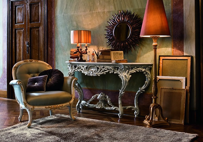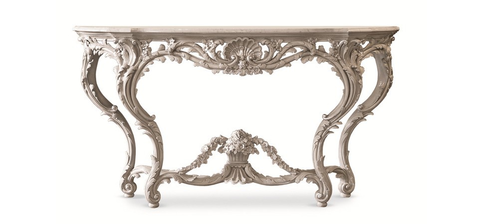 Console from the Italian producer Roberto Giovaninni. Model on figured legs. Material - wood. Finish to be selected from a catalog company. Decoration is the decorative carving handmade. Made in a classic style.