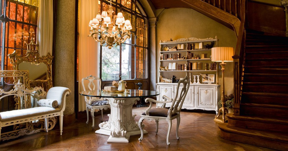 Dining room set from the Italian producer Roberto Giovaninni. Set includes round dining table with glass top, chair, bench, dresser. The frames are made from solid wood, hand carved. Color scheme - white. Set is made in a classic style.