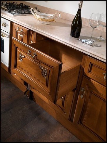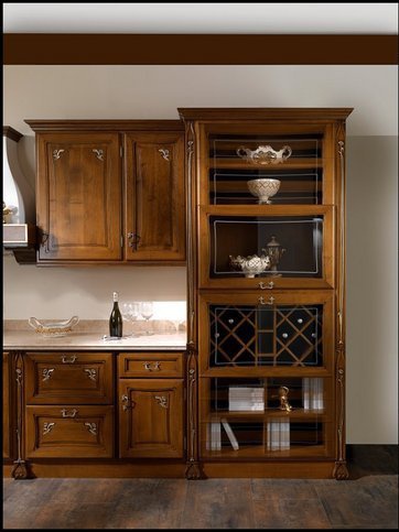 Kitchen with island Rubino walnut from the Italian manufacturer Only Wood. The frame is made from solid wood in the finishing varnish from the range of the campaign. Marble. Fittings - metal. The decor is entirely hand made. Set in a classic style. Colours in stock.