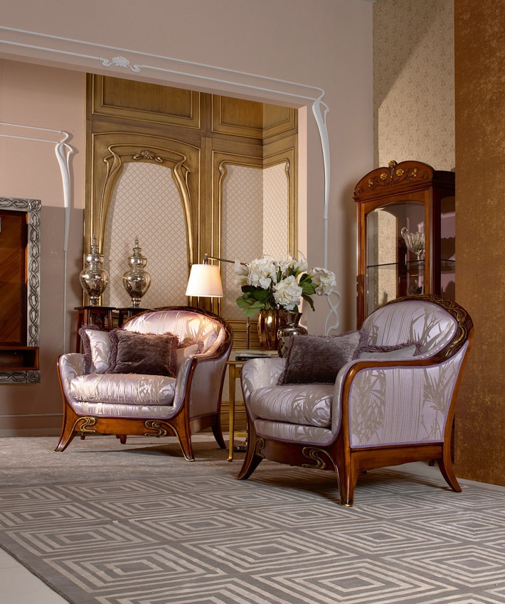 The Liberty chair from the Italian manufacturer Medea. The frame is made from solid wood, upholstery - leather or fabric. Elegant model living room in liberty style. Colors: white, brown, natural wood color.