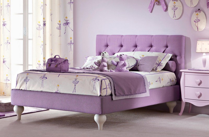 Children single bed PM.BD.YO.12 from Italian producer Piermaria. The frame is made from solid wood, upholstery - cloth from a range of campaigns. The headboard is decorated with stitch-Capito. The design of complementary decorative pillows and cushions. Colours: white, purple.