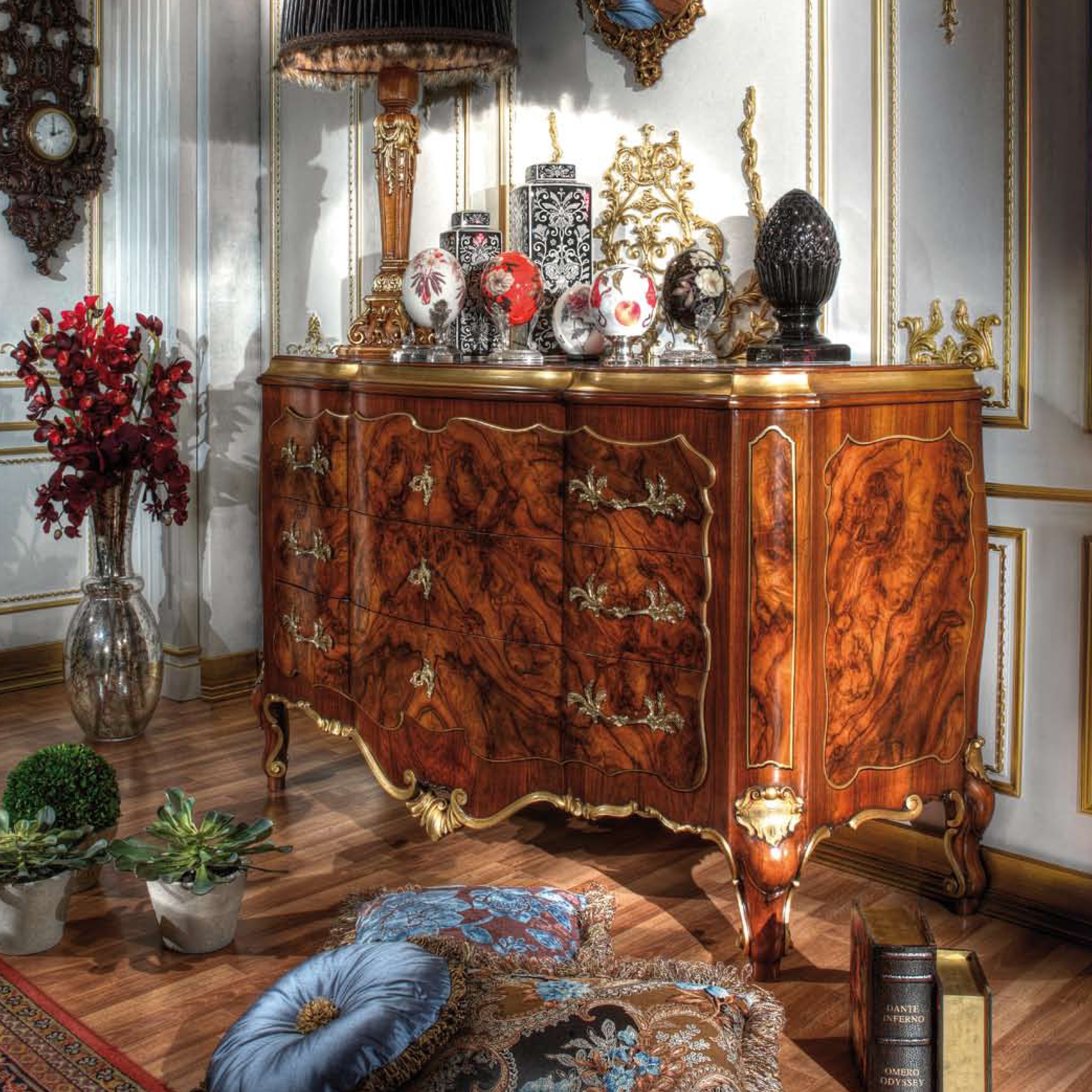 The Bluemoon chest of drawers from Italian manufacturer Asnaghi Interiors. The model is made in classic style. The body is made of solid wood, finishing in gold. Solid, roomy model. You will appreciate its true value.