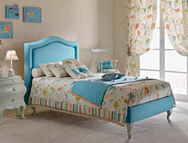 Baby bed with headboard PM.BD.YO.8 from the Italian manufacturer Piermaria. The frame is made from solid wood, upholstery - textiles from a range of campaigns. The design of complementary decorative pillows and cushions. Product color blue.