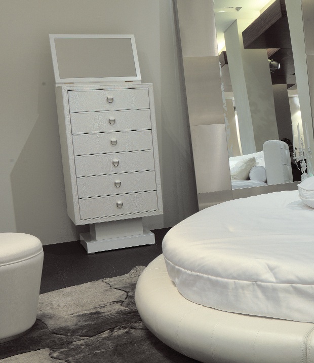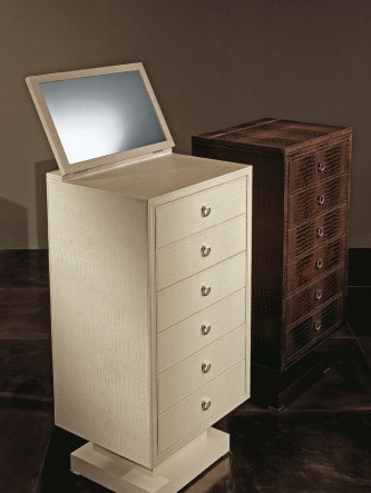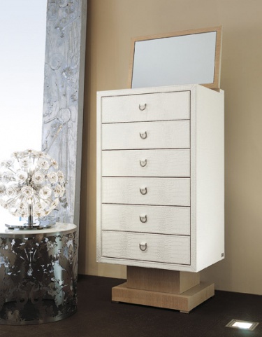 High dresser with leather upholstery, Parigi Rugiano. The frame on the basis of solid wood, varnished. As the trimmings are leather texture, colors to choose from the catalog factory. Arms and legs in finishes of steel or bronze. Especially for this chest of drawers was designed a mirror that perfectly accentuates its elegance and functionality. Original, tall dresser with 6 drawers surely will decorate the interior of your bedroom in a modern style with elements of glamour and art Deco.