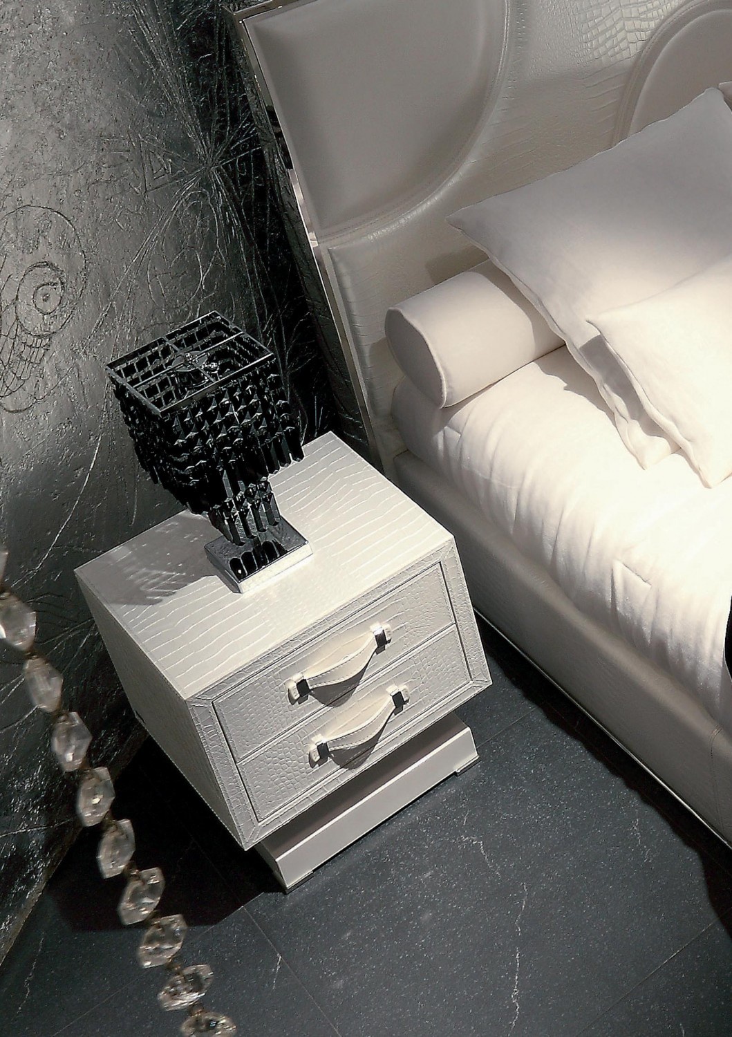 Bedside table Parigi, from the Italian manufacturer Rugiano. The frame on the basis of solid wood, varnished. As the trimmings are leather texture, colors to choose from the catalog factory. Arms and legs in finishes of steel or bronze. For your convenience the factory has provided two size. Bedside table with 2 drawers is sure to complement the interior of your bedroom, in a modern style with elements of glamour and art Deco.