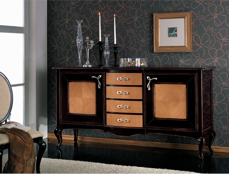 A Snack Bar Of Art. 256 from the Italian manufacturer Giorgiocasa. The frame is made from solid wood. Decorative accessories - metal. The model is decorated with marquetry. Sideboard with hinged doors and drawers. A pretty choice for interiors in classical style.
