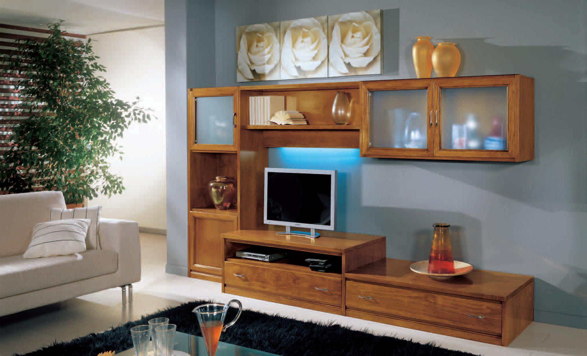 Modular system from Italian manufacturer Sangiorigo. Includes multiple storage units with hinged doors, drawers and open shelves. The body is completely made of solid wood. Shutters two types of deaf and glazed. Accessories metal. There is a place for TV.