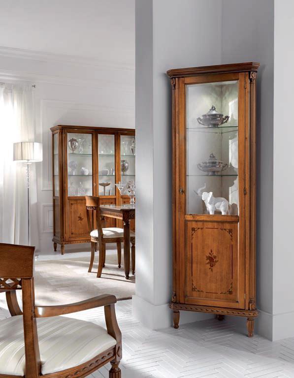 Corner showcase from the Italian manufacturer Sangiorigo. Body and legs made from solid. The finish is offered under the color of natural wood. Shelves and door made of transparent glass. The model is decorated with decorative painting handmade.