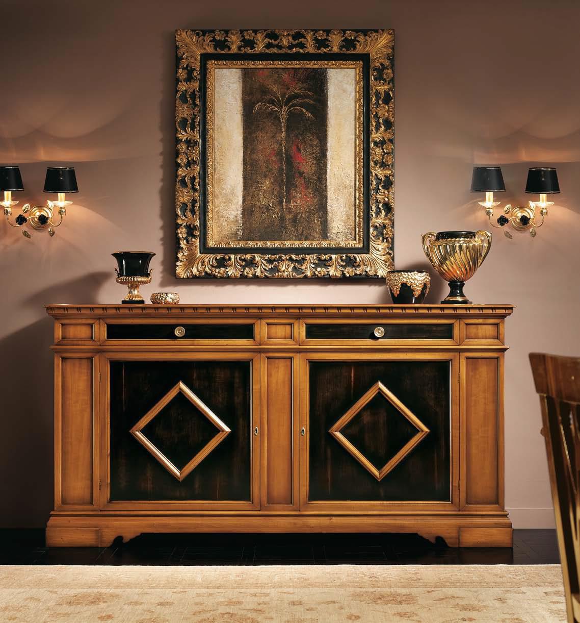 A chest of drawers from Italian manufacturer Sangiorigo. Elegant model in classic style. Material - solid wood. The finish offers high gloss lacquered black. Handles of metal. Complements the design and decorative carving.