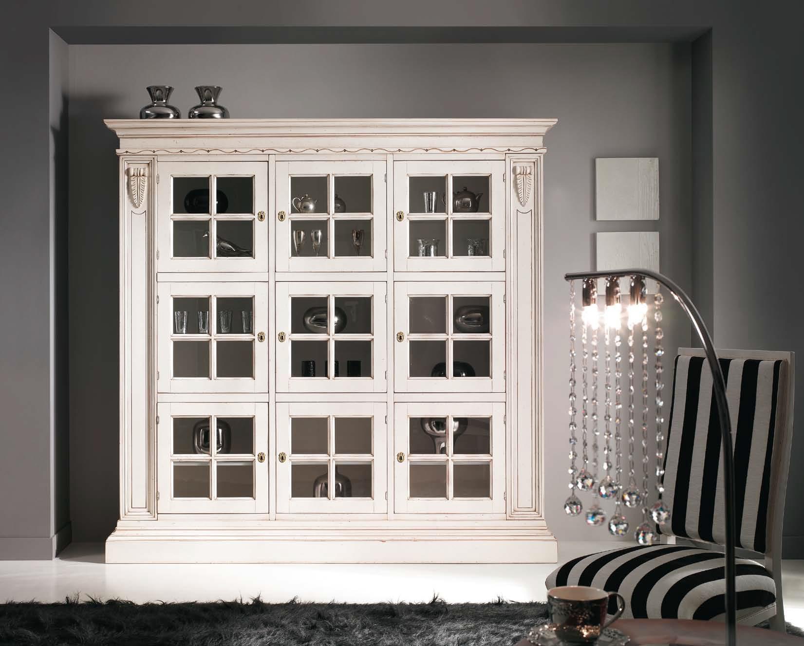 Showcase from Italian manufacturer Sangiorigo. Includes three sections. The body is made from solid wood. The surface is treated with a varnish of white color. Accessories metal. Leaf partially glazed. The model is decorated with hand-carved.
