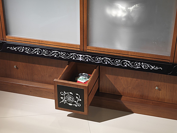 frame: solid wood base (veneer): walnut frame contour: ebony frame ebony: mother of pearl the back wall: mirror glass doors: glass mother-of-pearl on the frame, the contour of the Cabinet: inlay glass doors: Matt |