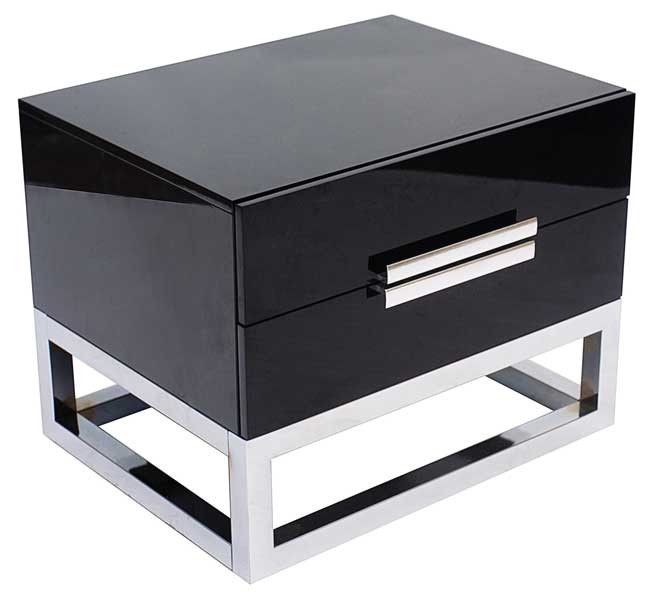 Double Watchtower side table from British producer Andrew Martin. Includes two drawers. Legs and handles in chromed metal. The body wood. Surface treated high gloss lacquered black.