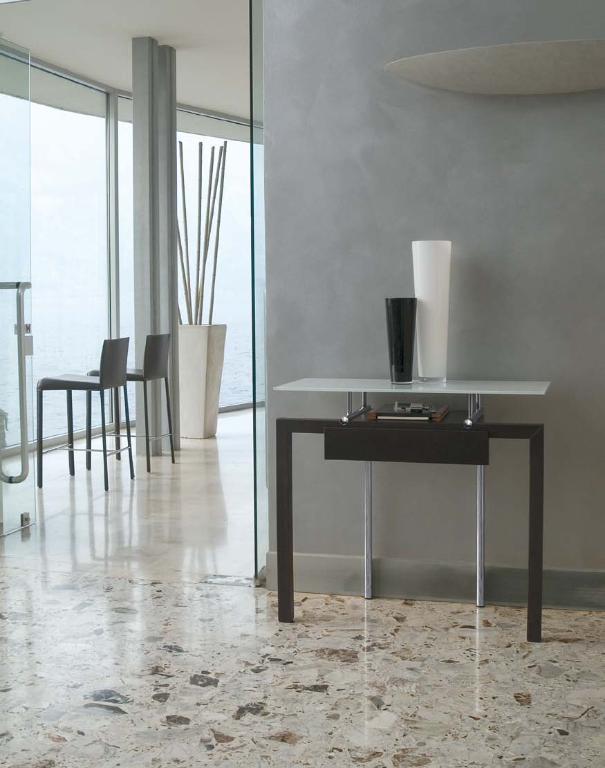 The table Gala from the Italian producer Antonello Italia. Made of tempered glass, natural wood and steel. Contemporary design execution. Colours in stock.
