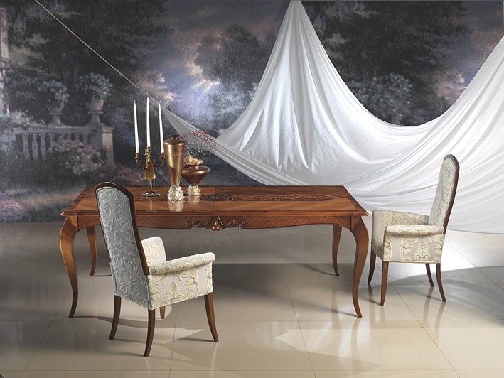 This beautiful sliding table with graceful curved legs will surely be a real decoration of dining area, living room or dining room in classic style. Note the geometrical pattern, which forms the nut Ferrara, which are veneered table top. The topic of diamonds sounds in the design of podstolja. The Central part of the top is decorated with an elaborate inlay (marquetry) of exotic tree species. Podstole carved, decorated with marquetry using mother-of-pearl. The top edge is decorated with a mosaic of valuable tree species.