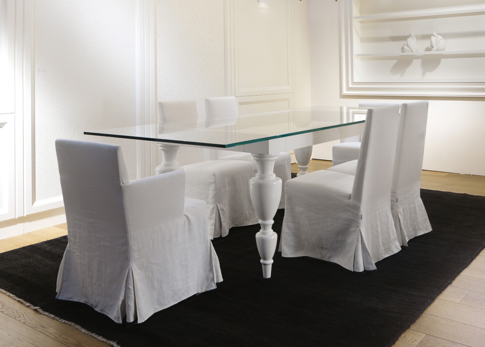 Dining table from the Italian manufacturer Castagna Cucine. Model on high legs curly shape. Material - solid wood. The surface is varnished in white. A rectangular top made of transparent glass of the highest quality. Made in a modern style.