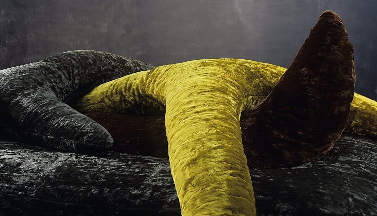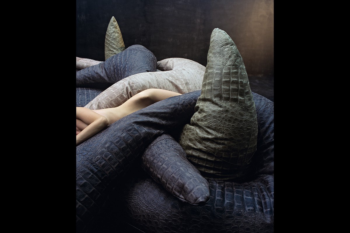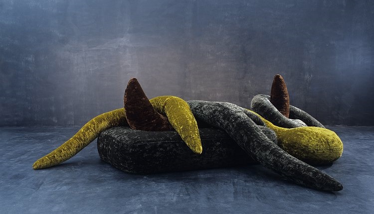 Frameless sofa by Kaiman Jakare from the collection Historia Naturalis created from several elements of irregular shape woven together like a ball of alligators.
