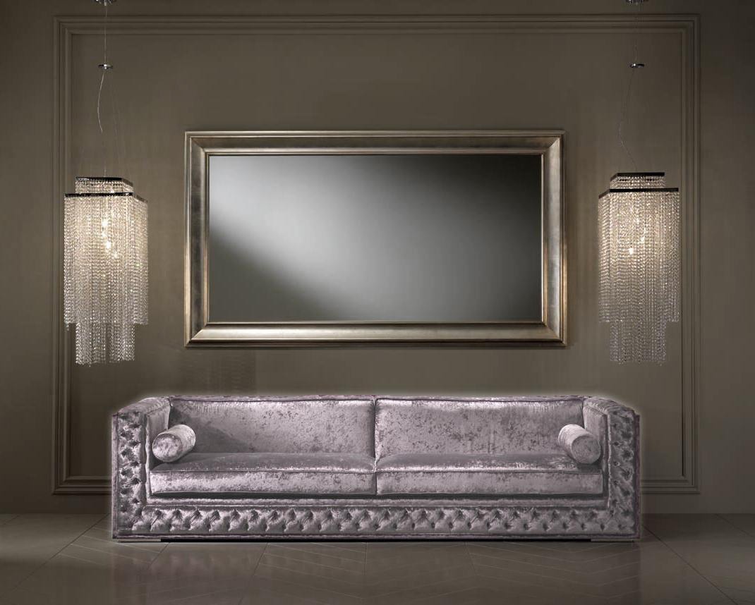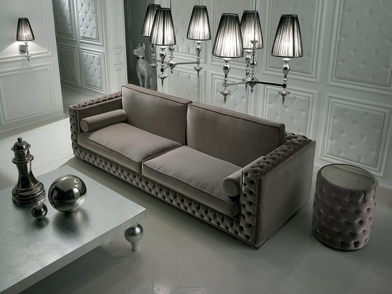 Triple Velvet sofa from Italian manufacturer DV Home. Luxurious sofa in rectangular shape with low-slung, which is a variation of the Lawson sofa, designed in art Deco style. Frame made of wood, legs made from light metal. Seat and backrest is formed by two large cushions on each side - two circular roller along the armrests. The perimeter sofa is finished with a decorative stitch Capito. Upholstery velvet, color catalogue of the manufacturer.