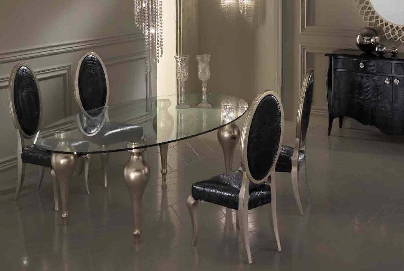Egoist dining table from Italian manufacturer DV Home. The frame is made from solid wood. Worktop - tempered glass. Top supported on four turned legs. The finishing - varnish. The model is suitable for the dining room in glamorous modern style . Colours in stock.