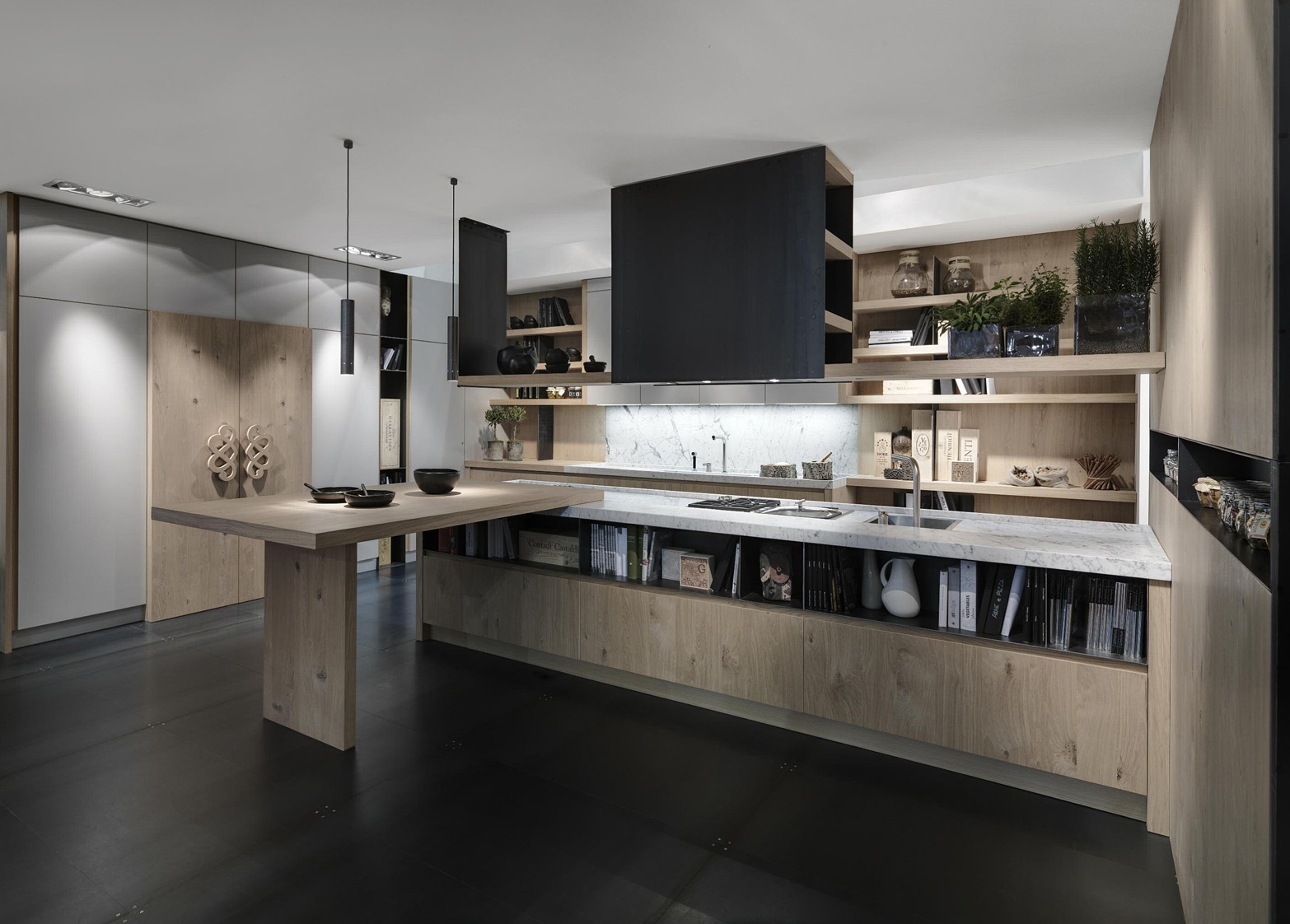 Set for the kitchen Natura from the Italian manufacturer Castagna Cucine. The model is made in a modern style. Includes a bar counter, cabinets and open shelves for storage. Material - solid wood. Marble. Finish to be selected from a catalog company. Equipped with built-in lighting.