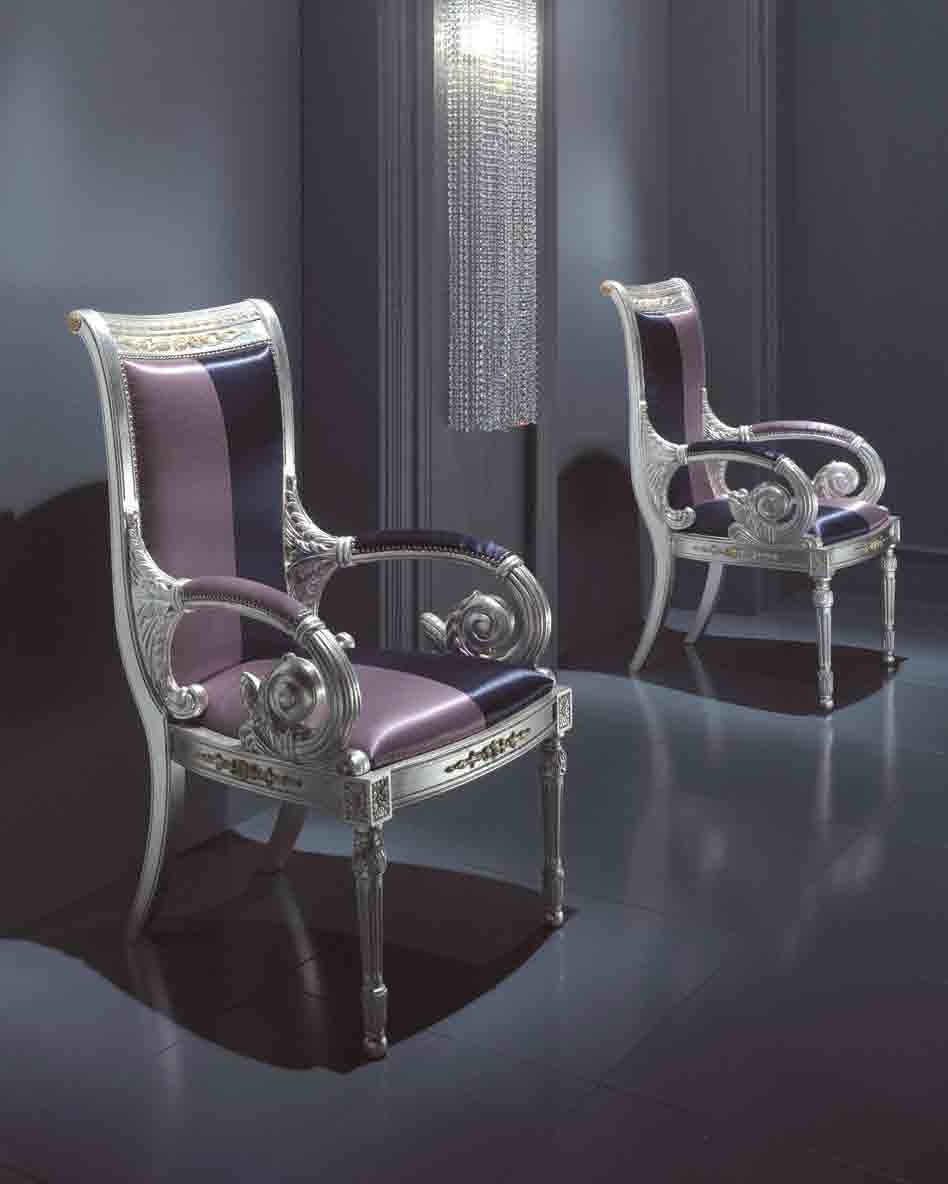 The chair comes from the Italian manufacturer DV Home. Model on a frame of solid wood. The model is decorated decorative hand carved. Upholstery textile. The color from the assortment of the company. The chair is made in eclectic style, with carved frame and arms, characteristic of the Empire style, combined with a bright glamorous upholstery.