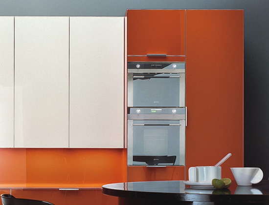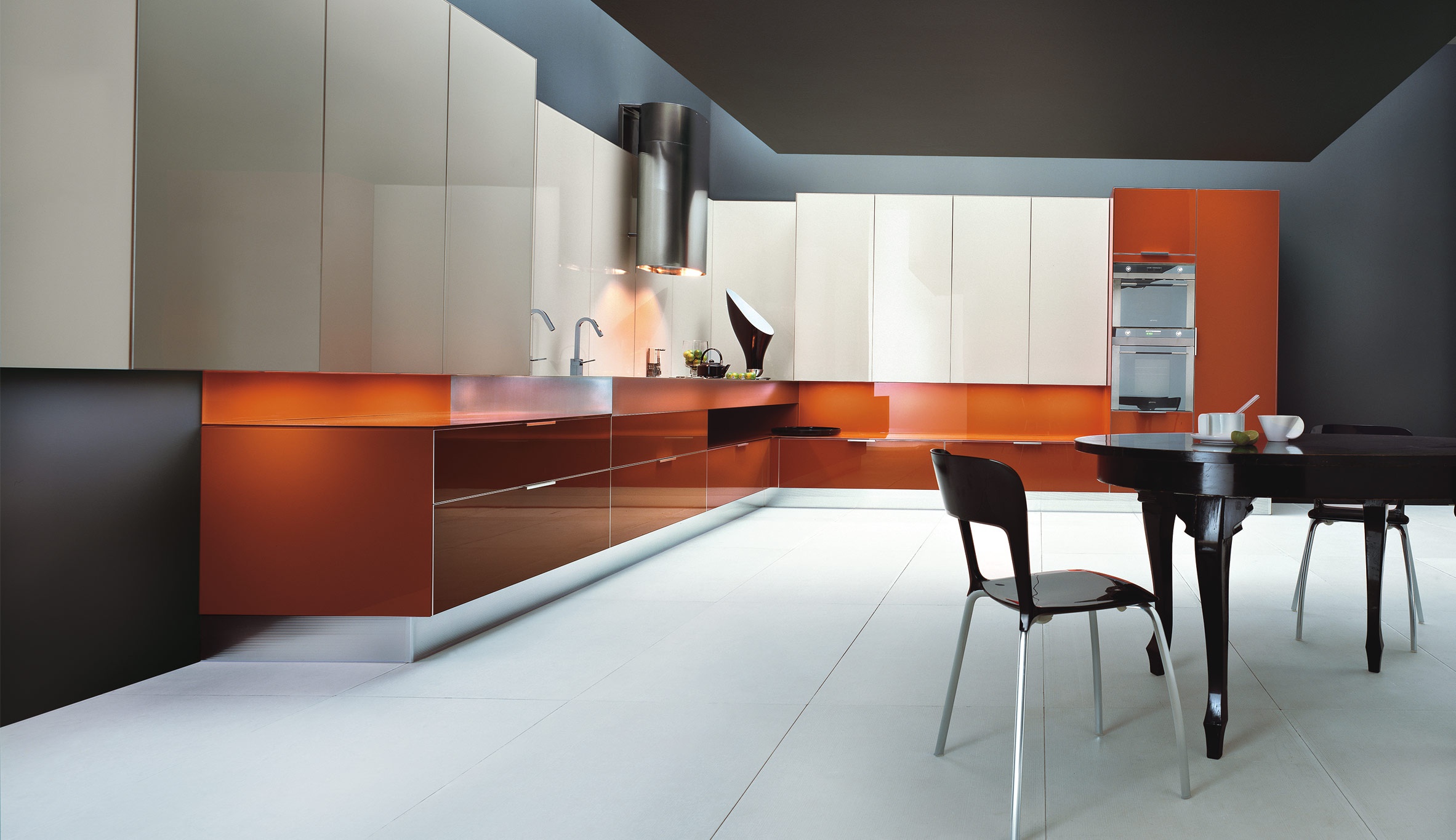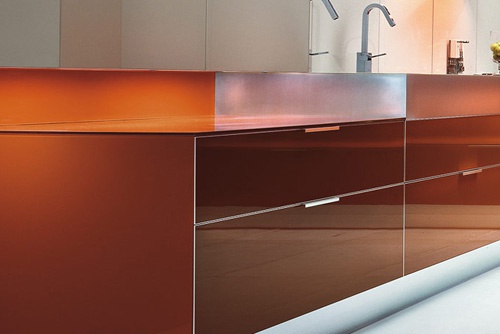 Modern kitchen in minimalist style with high-tech Luce from the Italian company Cesar. Fold bottom and high cabinets are in lacquered tempered glass color "papaya" with framework in shiny or brushed aluminum. Wall cabinets are also lacquered and tempered glass color "SCR" in the frame made of shiny or Matt aluminum. Stainless steel countertop casinoi 18 cm Oval wall hood is also made of steel nerzhaveyuschiy.