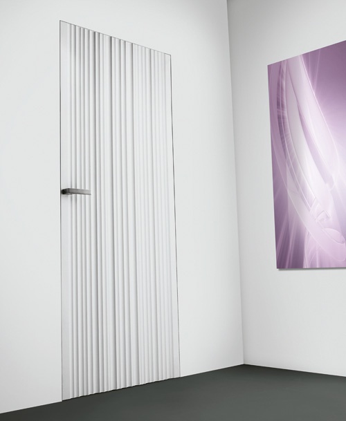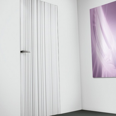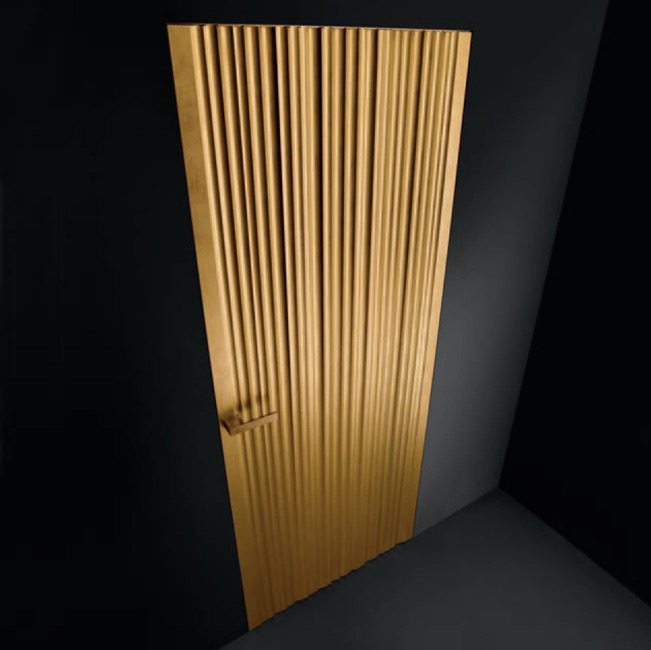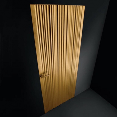 Interior door Wave from the Italian manufacturer Res. Hinged model with a hidden frame. Hinges completely embedded in the wall. The feature gives design the ribbed surface. Finish offered Golden or silver color.