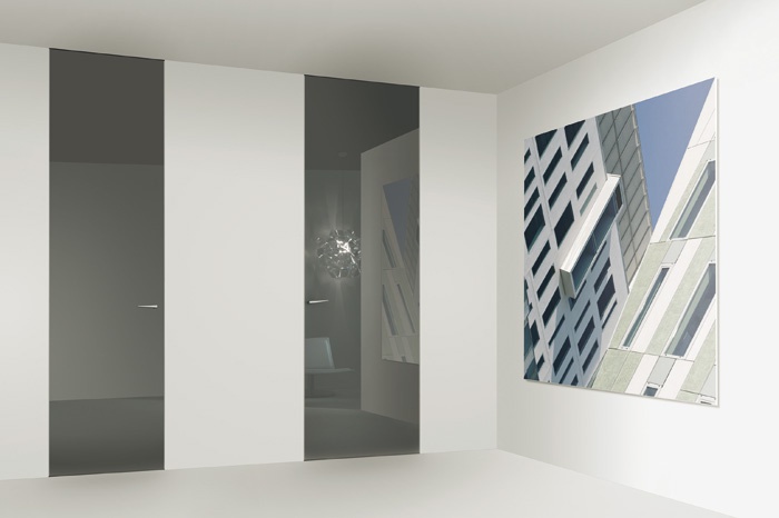 Interior door Levia from the Italian manufacturer Res. The model up to the ceiling. The profile and hinges are completely hidden. The canvas finish glossy lacquer. Colors to choose from for the company directory. The stainless steel handle.
