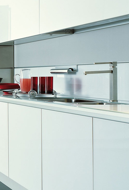 Modern kitchen in minimalist style with high-tech Luce from the Italian company Cesar. Fold bottom and high cabinets are in lacquered tempered glass in white color with shiny or Matt aluminum. Table top in white lacquered tempered glass with brushed aluminium edging with thickness 3 cm.