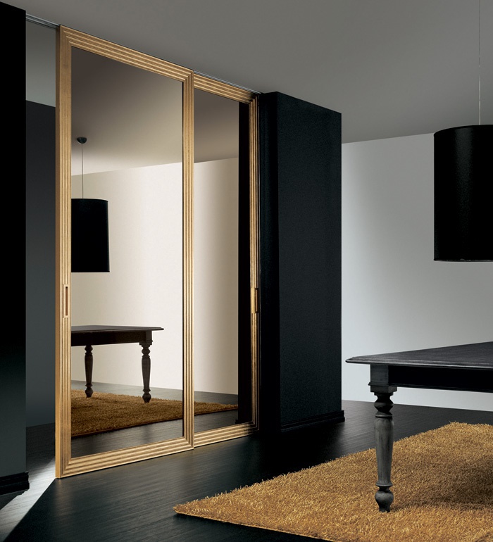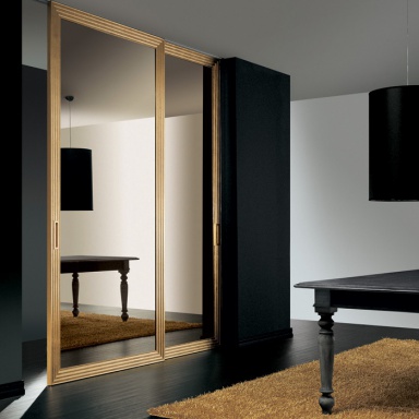 Interior partition Deco from Italian manufacturer Res. Model with sliding doors. The body is made from solid wood. The varnish finish offered Golden or black. Cloth made out of mirror glass. Is practical and compact.