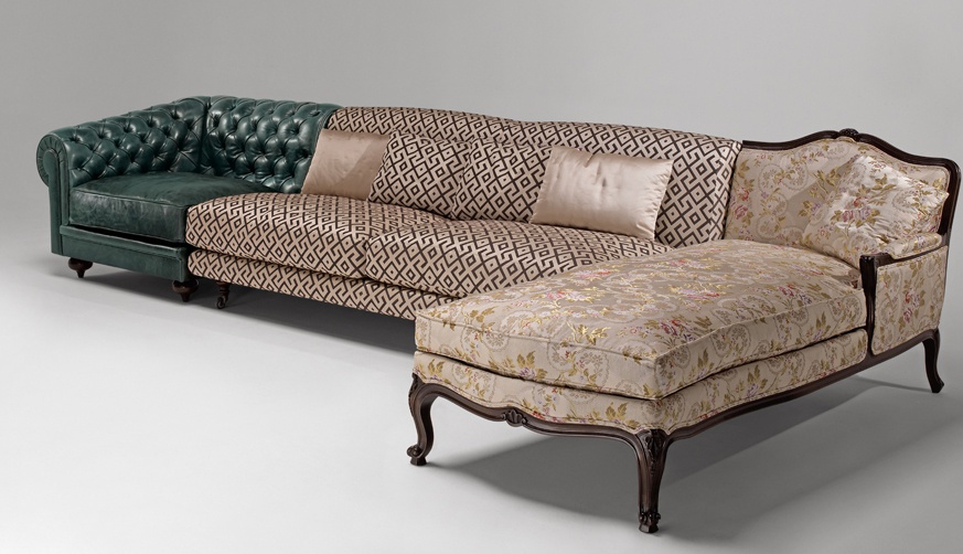 Sofa Italian manufacturer Fratelli Boffi. This model of sofa "Collage" consists of three modules. First in leather upholstery with diamond stitch "Capito". Followed by fabric upholstery with geometric designs. The composition is completed with a daybed in the Louis XV style, jacquard upholstery with a floral pattern. Furniture presented in a mixed classical style.