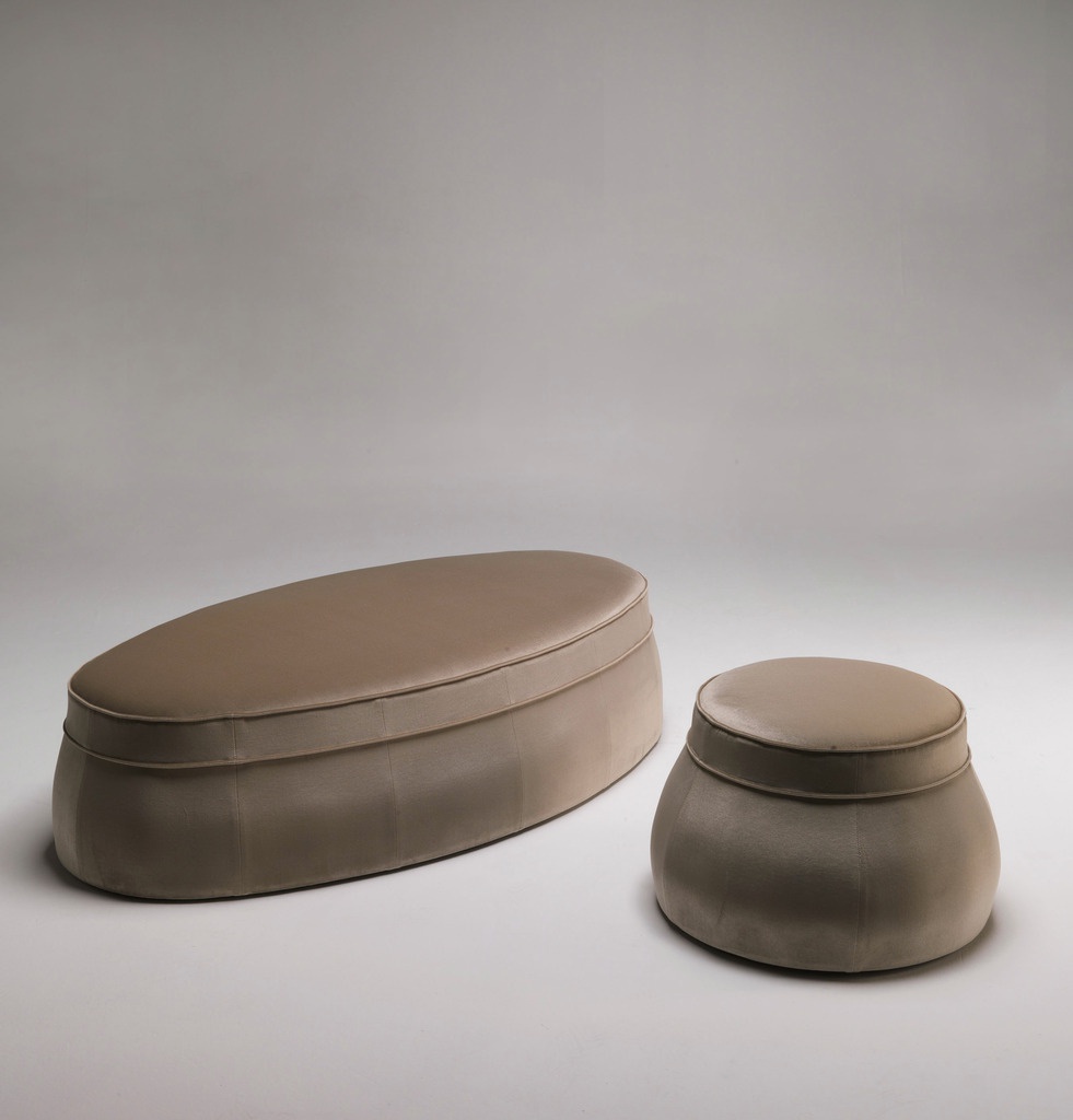 Ottoman collection Kir Royal Italian manufacturer Fratelli Boffi. Model round and oval shapes, the frame is made of wood. Upholstery made of velvet, light brown in color. The style is modern, however, with borrowing classical features.