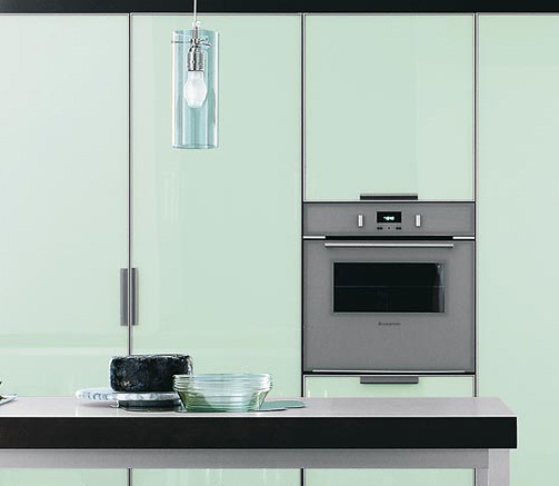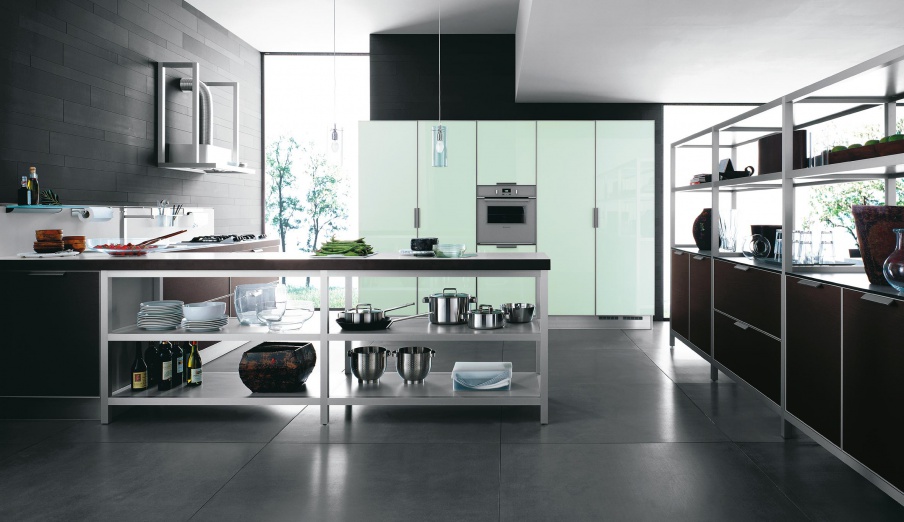 Modern kitchen in minimalist style Coco from the Italian company Cesar. Fold bottom and high cabinets made of aluminum veneered panel of dark oak. Sash high cabinets in lacquered glass in aluminum frame. High sideboard with doors with anoplogaster opening. Tabletop in white laminate with wooden edges, thickness 6 cm