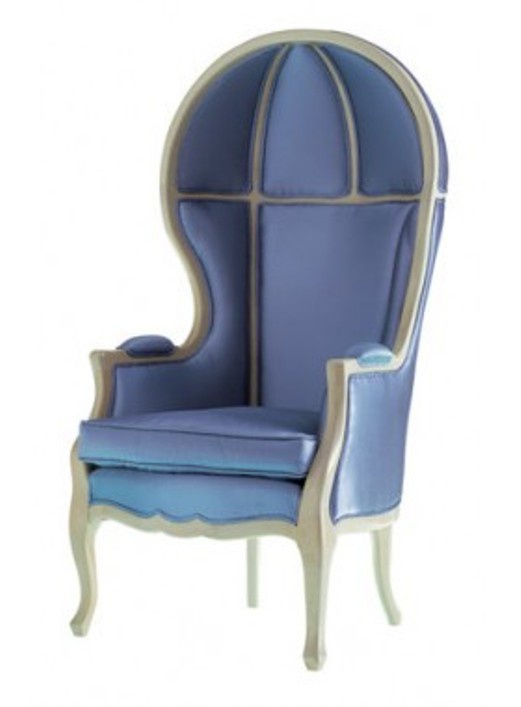 The chair of the Italian manufacturer Fratelli Boffi. Chair frame is made of wood, fabric satin, color blue, finish gloss white. The model resembles the papal throne, the upper part of the back bears the image of the chapel. Presented in a classic style.