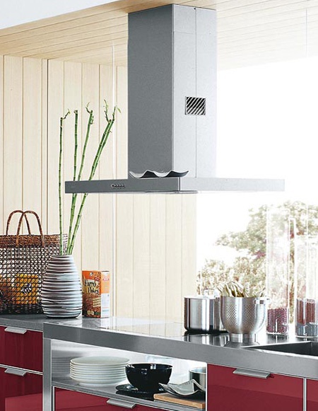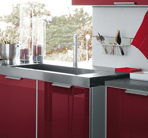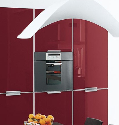Modern kitchen in minimalist style Coco from the Italian company Cesar. Fold bottom and high cabinets in lacquered glass Burgundy color with shiny or Matt aluminum. Worktop and side panels in steel thickness 8 cm cooker Hood STILO.