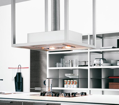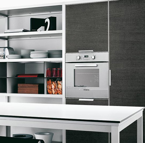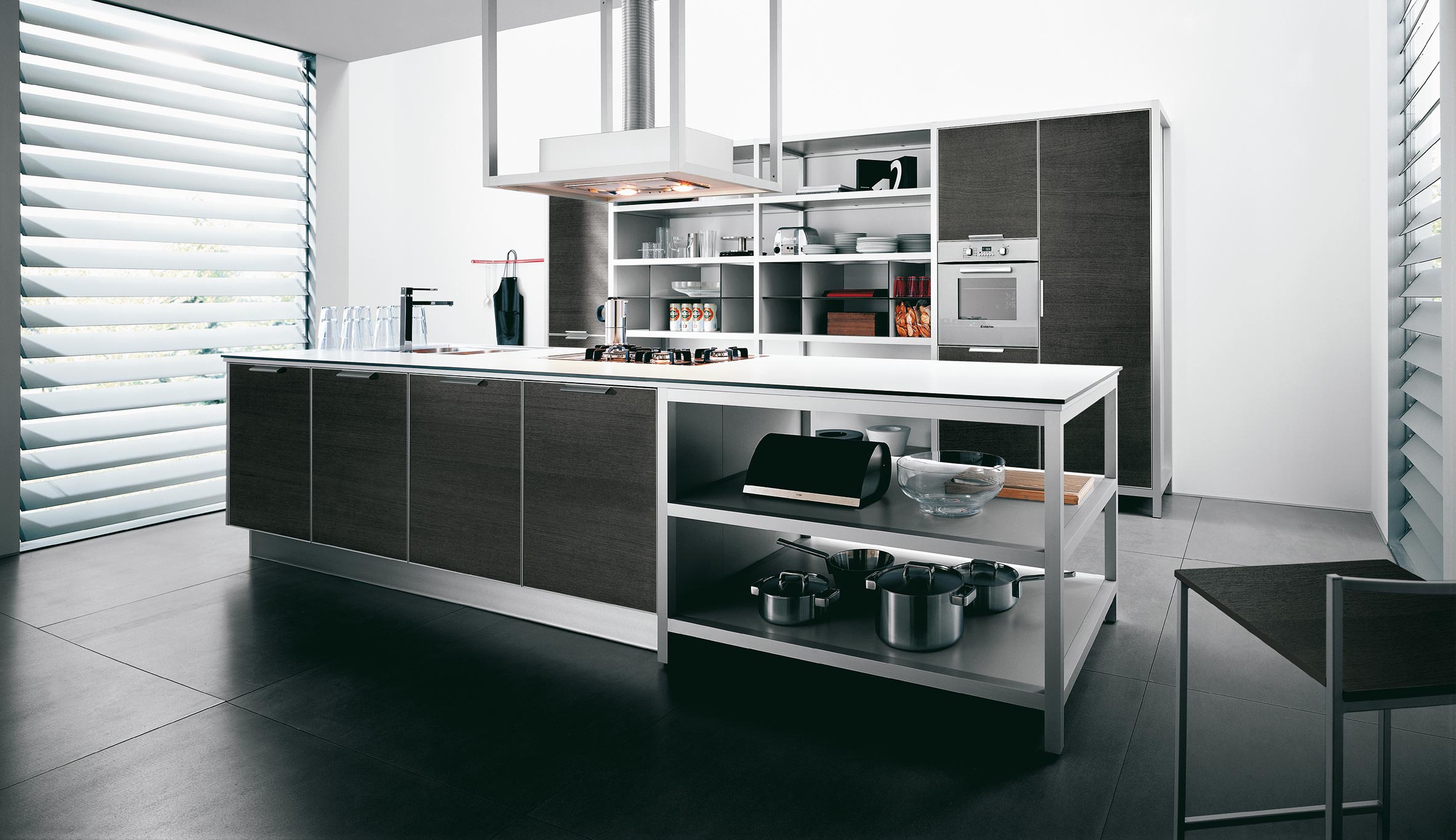 Modern kitchen in minimalist style Coco from the Italian company Cesar. The Cabinet fronts of the panels grey oak veneer in the framework of aluminium. An open frame of alumina. The tabletop is laminated with a thickness of 1.2 cm with the edge of aluminum. Extract COCO.