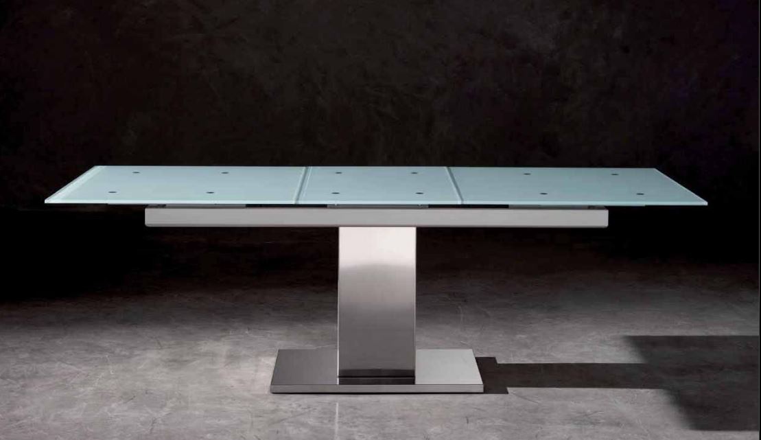 Dining table Deva, from the Italian manufacturer Airnova Italia. The stem and base are made of metal. The surface is transparent and strong glass. The model is transformed into a table with a shorter top. The style is modern.
