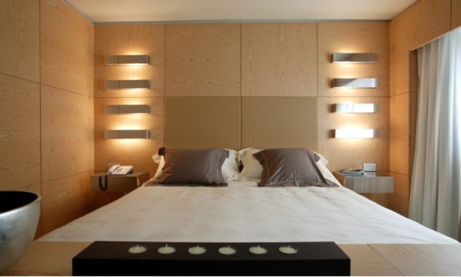 Bed Italian manufacturer Fratelli Boffi. Bed frame made of natural wood. Upholstery made of velvet, sand-olive color. The panel at the high headboard, upholstered in velvet. The model is made in modern style.
