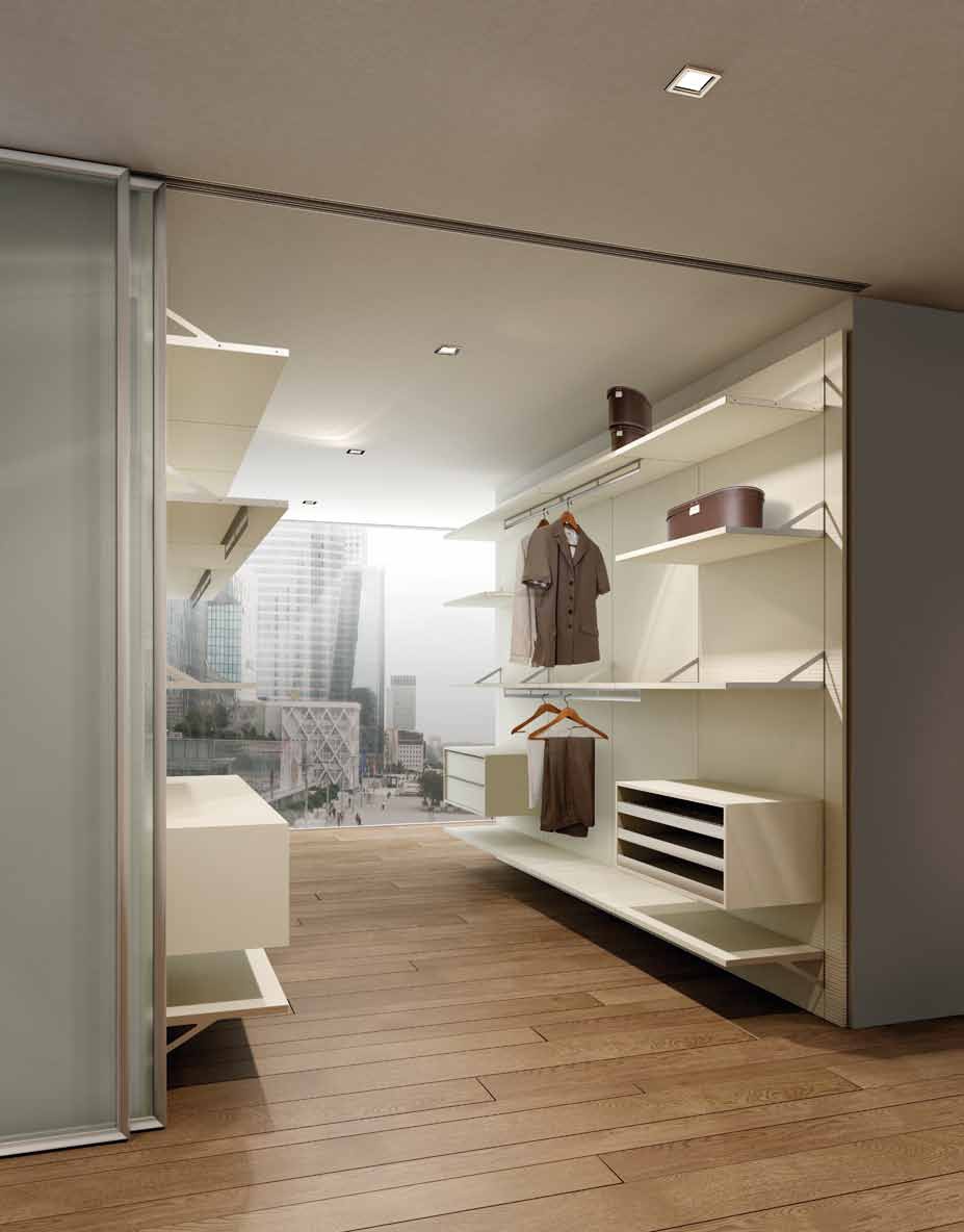 Dressing room Charme with modular accessories from Italian manufacturer Astor Mobili. Materials - wood finish white high gloss lacquer finish. Sliding door - tempered glass. The frame is made of aluminum.