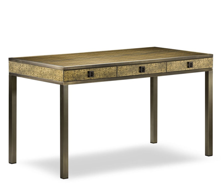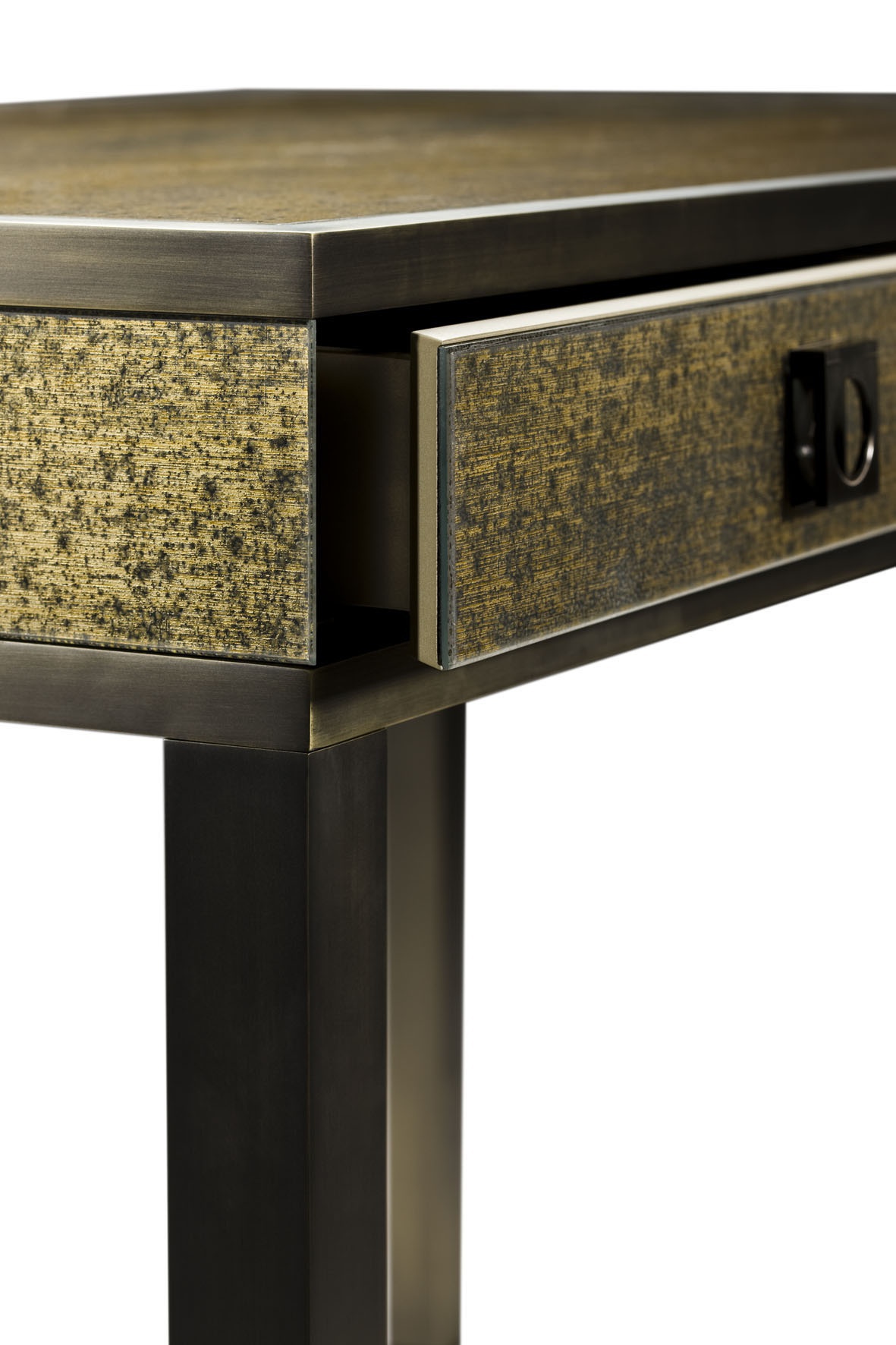 A Desk, Aida, from the Italian manufacturer Armani Casa. Top, side surfaces and drawers are panelled, partly decorated with transparent glass combined with bronze skin color, with the effect of shagreen leather. The base and handles are made of bronze brass. Limited edition of 100 pieces Design solution for your office or library in a modern style.