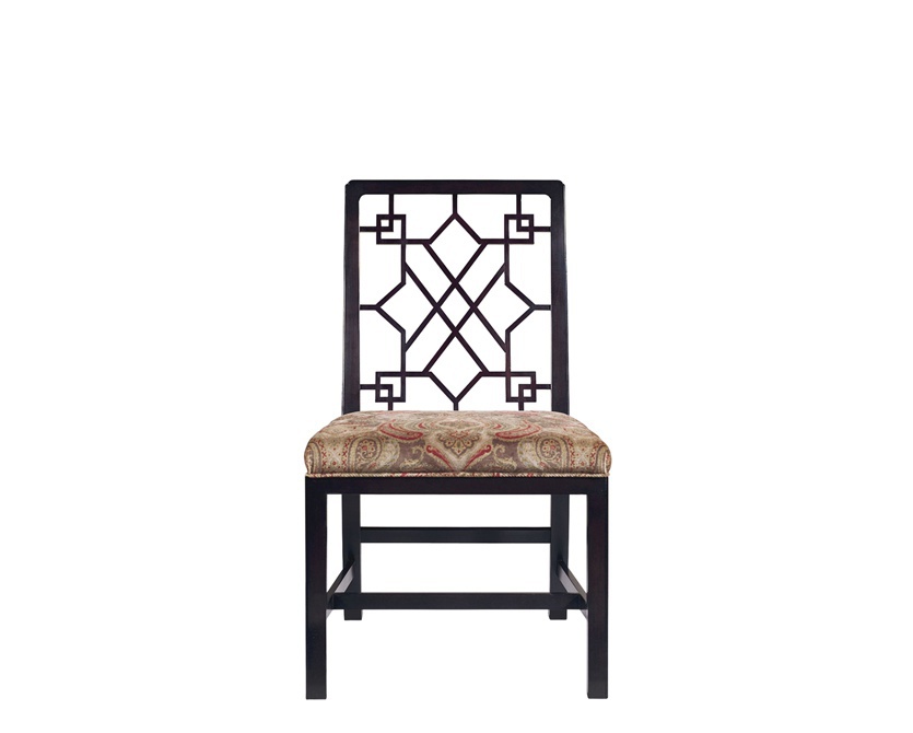Chair Chinese Chippendale Side from the American manufacturer Baker. The model is handcrafted with a mahogany frame. The black lacquer finish. The seat is covered with textile. A polyurethane filler. The model is widely spread in England of 1760 years. Beautiful decoration of interior design in art Deco style.