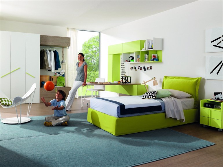 Headsets for children from the Italian manufacturer Zalf. Set includes: single bed with upholstered headboard, the bedside table on castors, modular system for books with built-in Desk and wardrobe. The furniture is made of solid wood in the finishing varnish from the range of the factory. Design in modern style. Colors: white, light green.