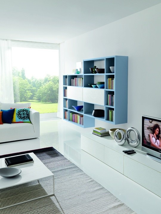 Modular storage system for books and TV from Zalf Italian manufacturer. The body is made of melamine. The wall is designed for modern interiors. Colors: white, blue.