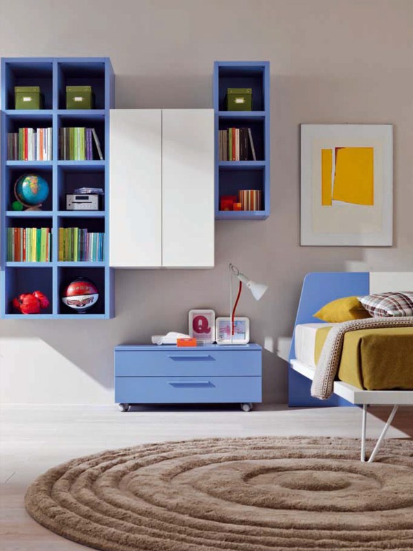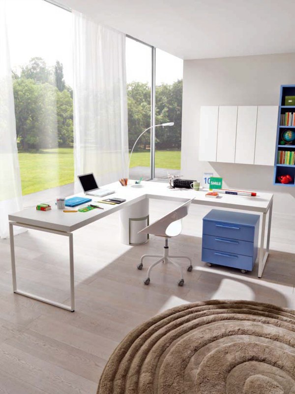 Set for kids room from Italian manufacturer Zalf. The set includes: single bed, Desk, two bedside tables and a mobile module for books. The furniture is made of solid wood. The surface is treated with varnish from the range of the factory. Foot of the bed and the table made of painted metal. Set in a contemporary style. Colors: white, blue.