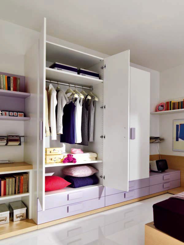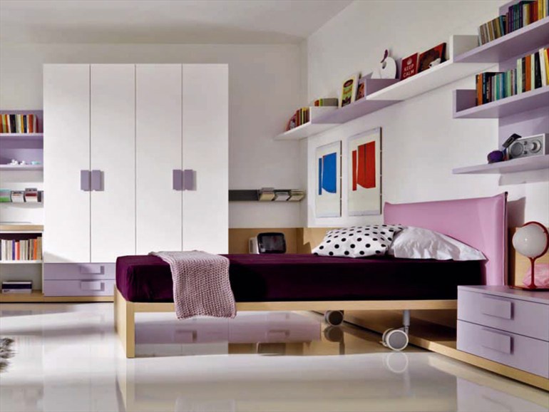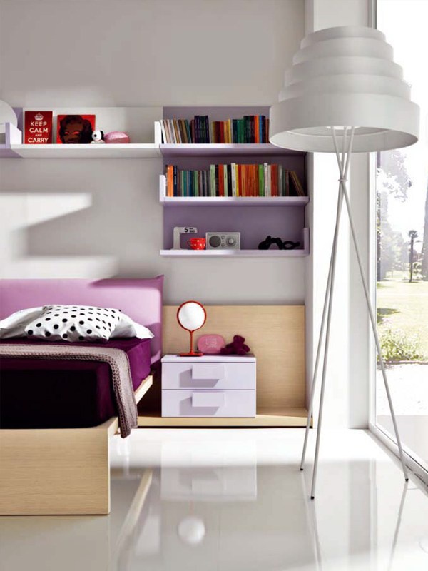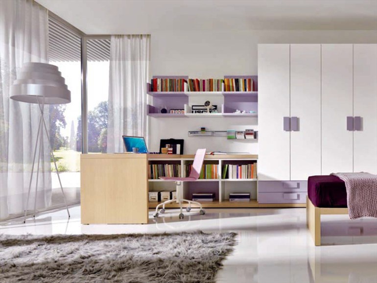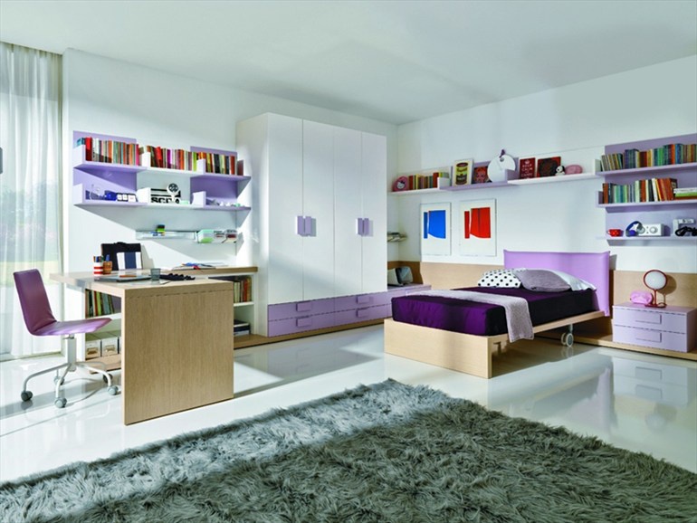 Headsets for children from the Italian manufacturer Zalf. The set includes: single bed with upholstered headboard, a modular system for books and clothes, a writing Desk and a bedside Cabinet. The furniture is made of solid wood. Finishing varnish from the range of the factory. Design in modern style. Colors: white, natural wood color, purple.